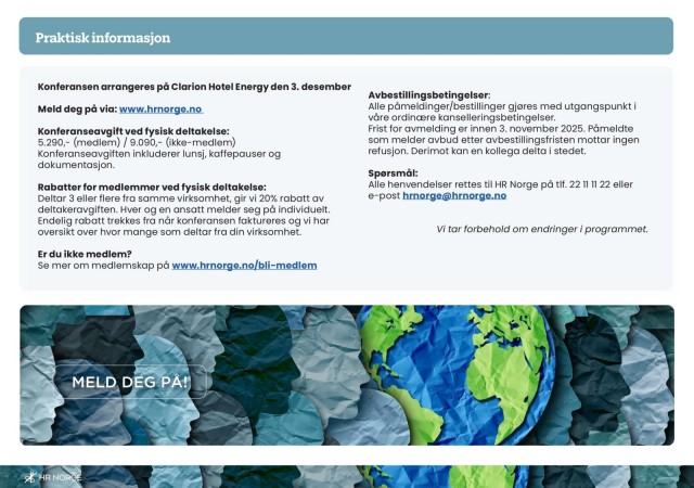 Deltar 3 eller flere fra samme virksomhet, gir vi 20% rabatt av e-post hrnorge@hrnorge.no